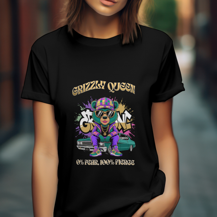 Tricou regular fit „Grizzly Queen” – 100% bumbac, croială lejeră și design urban pentru femei puternice și curajoase. 0% frică, 100% stil!