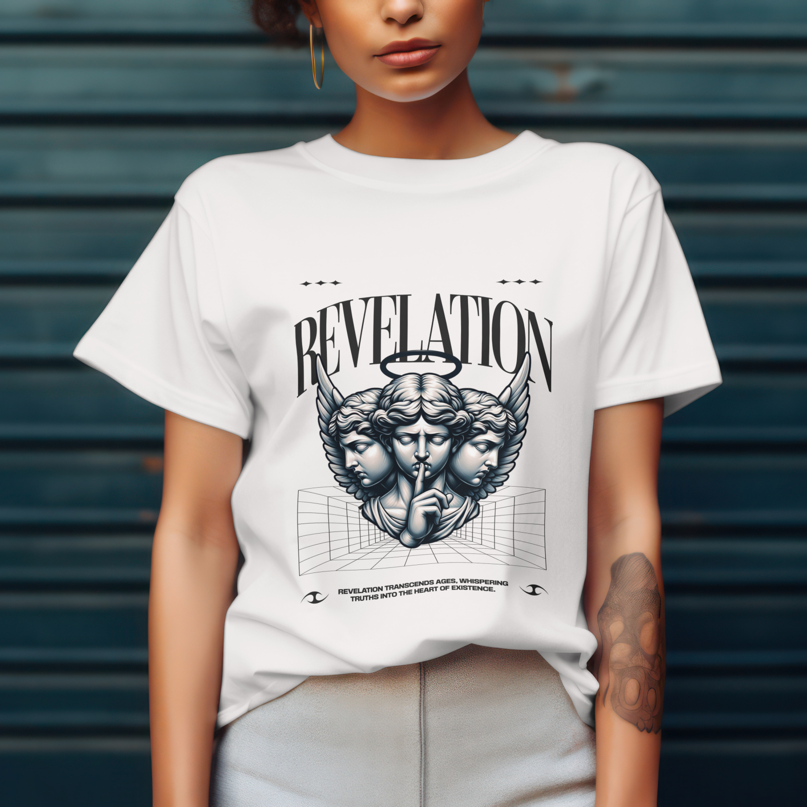 Tricoul „Revelation” este o piesă statement, cu un design inspirat din simbolistica sacră și mistică. Ilustrația centrală – o compoziție cu trei fețe angelice – evocă revelația interioară, protecția divină și profunzimea viziunii personale. Este mai mult decât un articol vestimentar – este o expresie a spiritului.